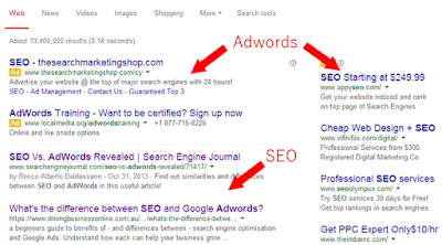 | Google ads traditionally appeared at the top and right side of a SERP. Despite the prominence of AdWords, many browsers choose to trust the first organic result. [Photo Source] |