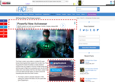 So your content above the fold should inspire a browser to scroll below the fold. Above the fold ads often inspire browsers to click away. The Sistrix study cites the case of Thefactlist.com, which lost 50% of its traffic post-Fred on Google UK. The layout before the update shows an ad-heavy page with two AdSense ads above the fold:
